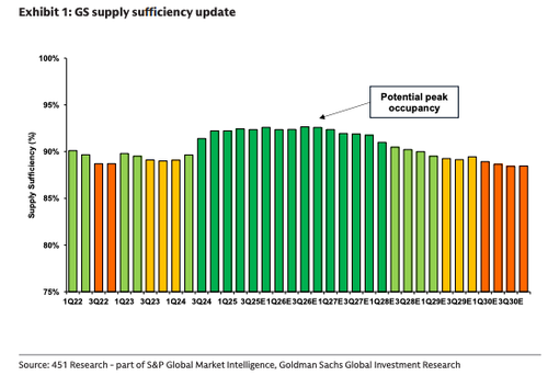Also, Goldman’s James Schneider told clients, “The net impact of our model updates extends the duration of peak datacenter occupancy well into 2026 (from the end of 2025 previously). After this point, we forecast a modest, but gradual loosening of supply/demand balance in 2027…”