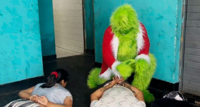 The strange video did not end there as at one point the Grinch cop, still in full costume, seemed to give one of the suspects a finger-wagging telling off.