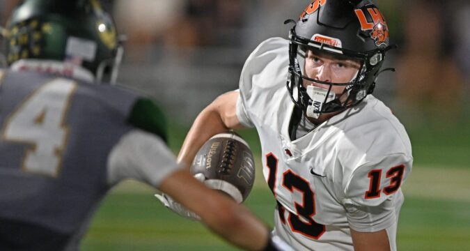 Libertyville’s Brock Williams (13) blocks Lake Zurich’s Brock Rubicz (30) during a North Suburban Conference game against Lake Zurich in Libertyville on Friday, Sept. 20, 2024. (Rob Dicker / News-Sun)