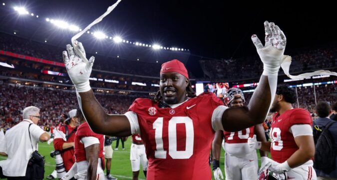 GettyFormer Alabama Crimson Tide defensive lineman Jehiem Oatis celebrates after his team’s victory against the Georgia Bulldogs on September 28[/caption]