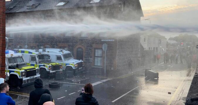 La policía utilizó cañones de agua y balas de goma para tratar de dispersar a una multitud de varios cientos de personas en la ciudad, ubicada a 40 kilómetros (25 millas) al norte de Belfast.