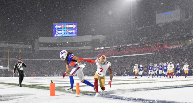 Steady snowfall turned Highmark Stadium into a winter wonderland for the “Sunday Night Football” matchup between the Buffalo Bills and San Francisco 49ers, creating a unique aesthetic that only happens every so often in NFL games.