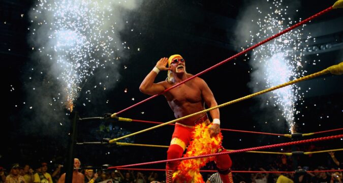 Hulk Hogan fires up the crowd between matches during WrestleMania 21 in Los Angeles, Calif. on April 3, 2005. As WrestleMania approaches 40, it’s never been bigger.
