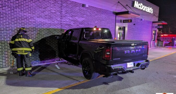 Photos posted to the Hackensack Fire Department’s Facebook page show the front end of a Dodge Ram 150 poking through the eatery’s broken brick wall. Equipment inside the McDonald’s appeared to have been knocked down and damaged too.