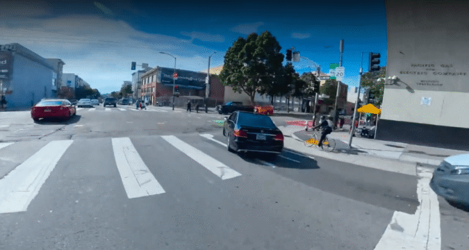 The clip shows a black Mercedes pulling into traffic before abruptly turning into the path of a cyclist traveling in a designated bike lane.
