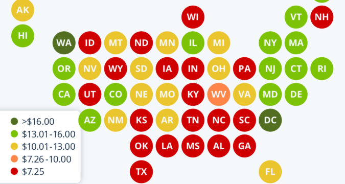 As Statista’s Katharina Buchholz details below, the United States is made up of a patchwork of minimum wage laws with 30 states and D.C. having a rate higher than the federal minimum of $7.25 per hour.