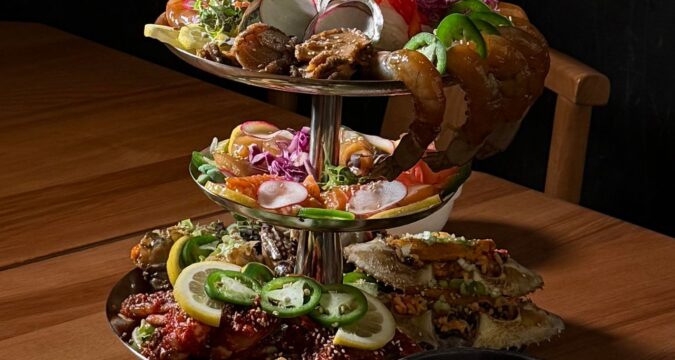A recent dinner started with shots of soju, nibbles of banchan, and Rice Thief–branded bibs. When the stainless-steel tower of cold, glistening seafood arrived, I first went to pluck one of the six sesame-sprinkled shrimp hanging off of the middle level with my plastic-gloved hand before our server relayed some instructions. “Mix the rice inside the body of the crab,” he said, pointing to large filled shells at the base, “then with the marinated pieces, squeeze the crab on the nori and add some of the banchan for more flavor.”