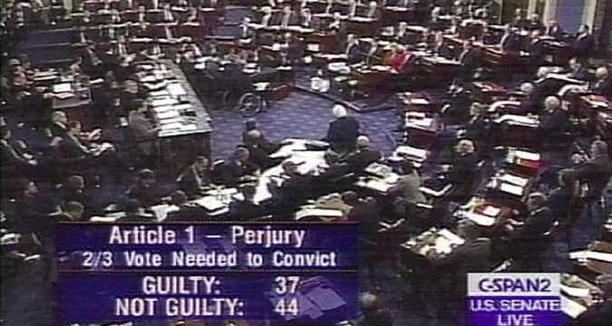 On Feb. 12, 1999, the Senate voted to acquit President Bill Clinton in his impeachment trial of charges of perjury and obstruction of justice.