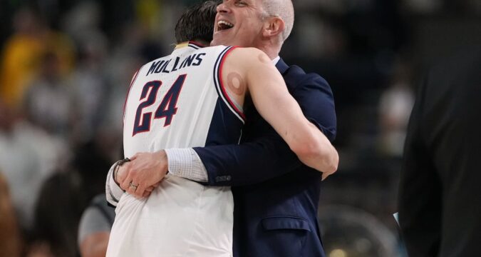 Mullins sent the Huskies past Duke, the top overall seed, in the Elite Eight last weekend with the shot of the tourney — a 35-foot 3-pointer with 0.4 seconds left. He was equally effective this time, a short drive from his hometown of Greenfield, Indiana.