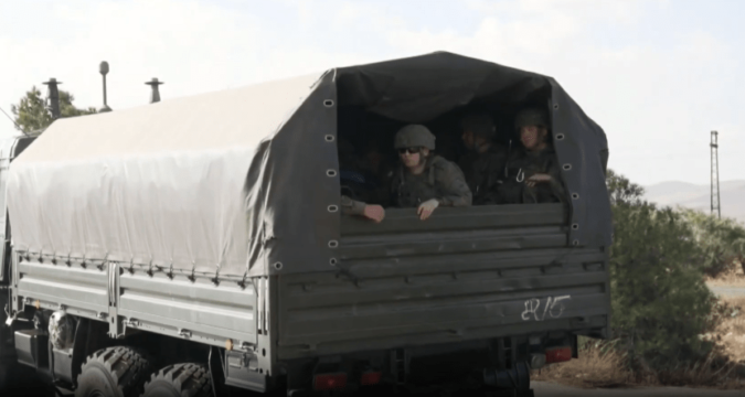 Youtube/ Chanel 4Russian troops bundled inside trucks leaving Syria[/caption]