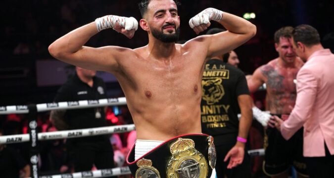Slim Albaher celebrating his victory in the light-heavyweight bout against Tom Zanetti at the OVO Arena Wembley, LondonPA